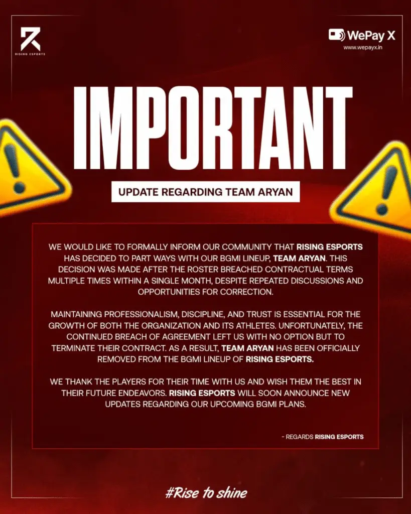 Rising Esports has officially cut ties with its BGMI lineup, Team Aryan, following repeated breaches of contractual terms. The organization announced the decision on social media, stating that the roster violated multiple agreement clauses within a single month despite several discussions and chances to correct the issues.